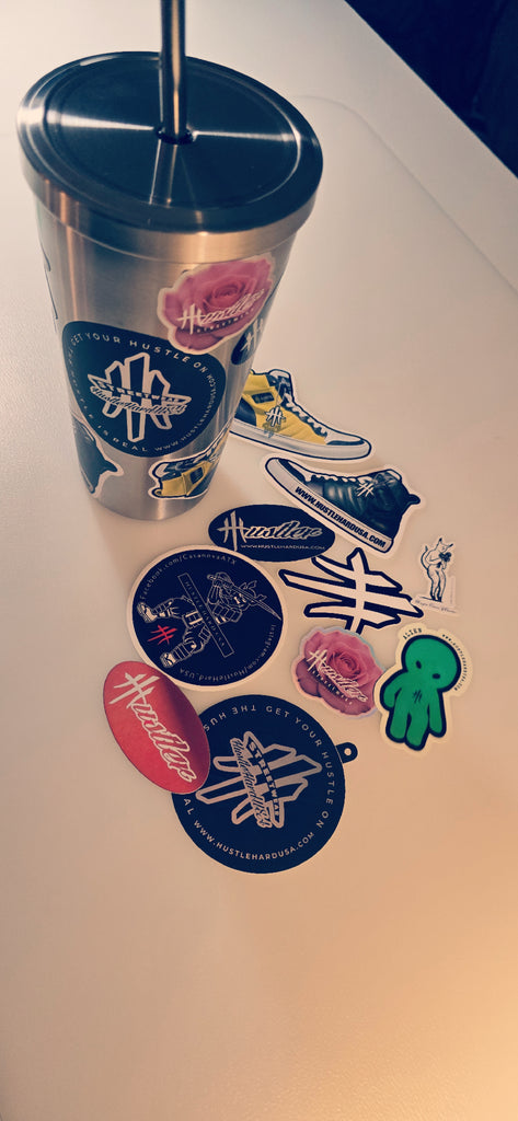 GET YOUR HUSTLE ON with this beautiful Stainless Steel Tumbler! You'll receive a starter kit of 10 HustleHardUSA vinyl, waterproof stickers!
