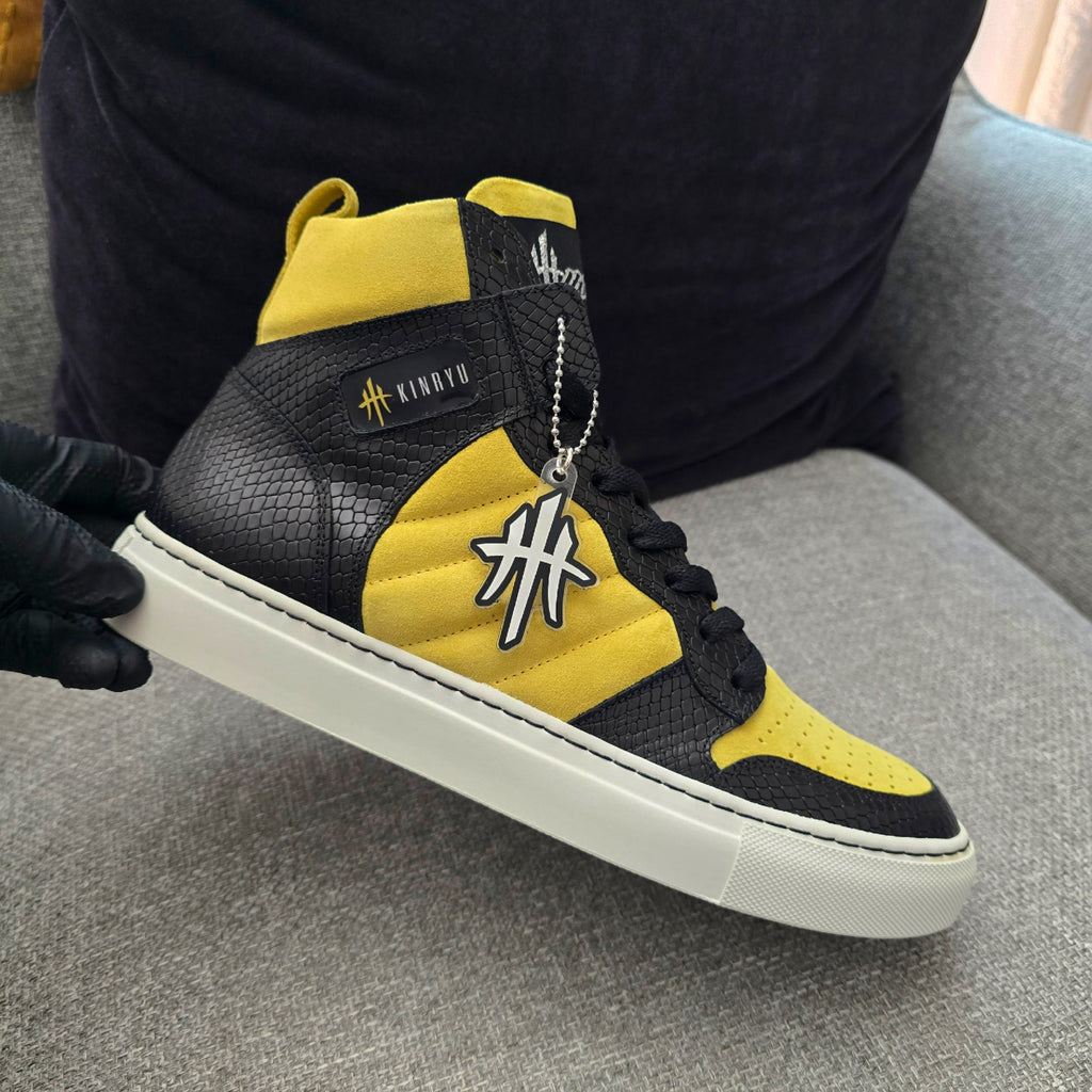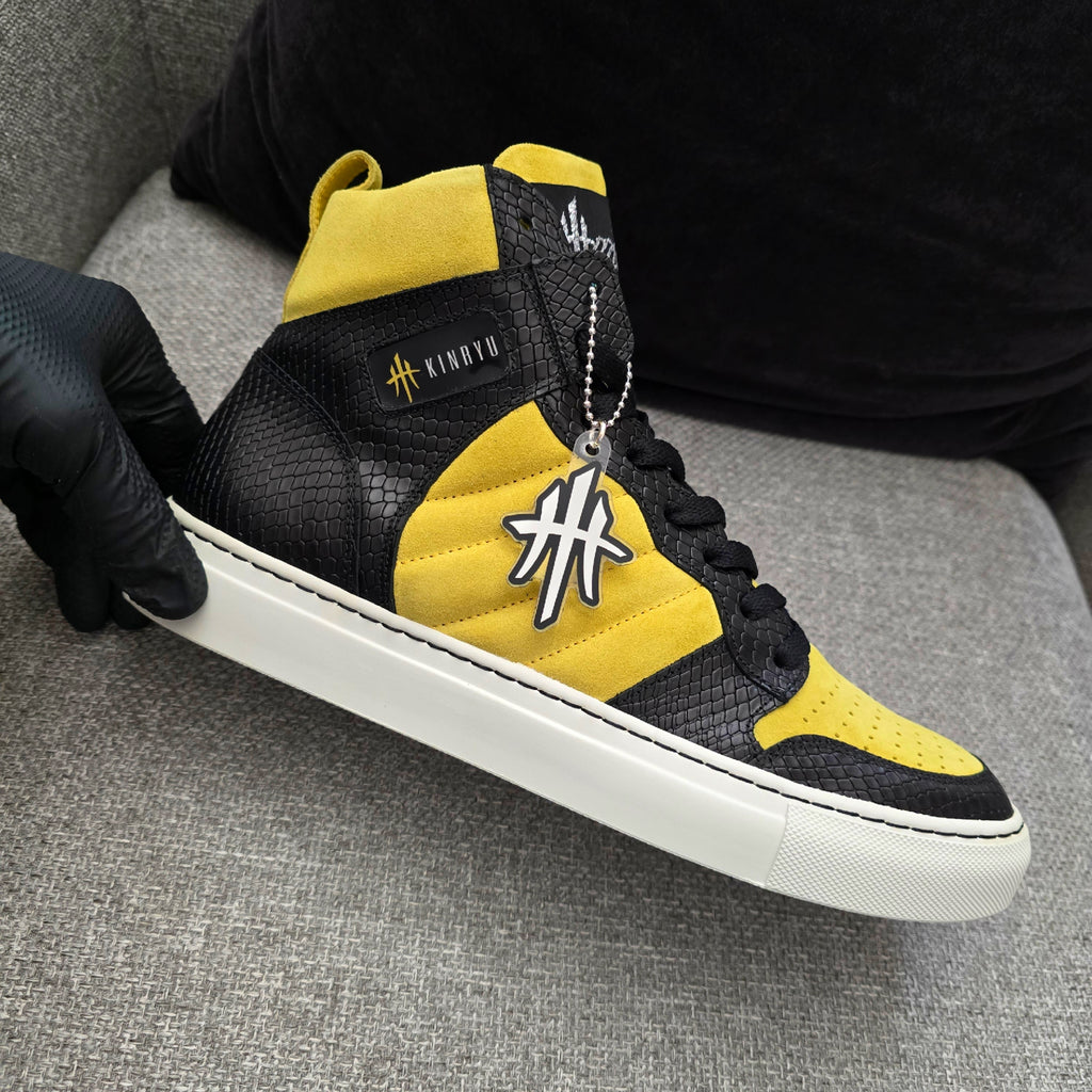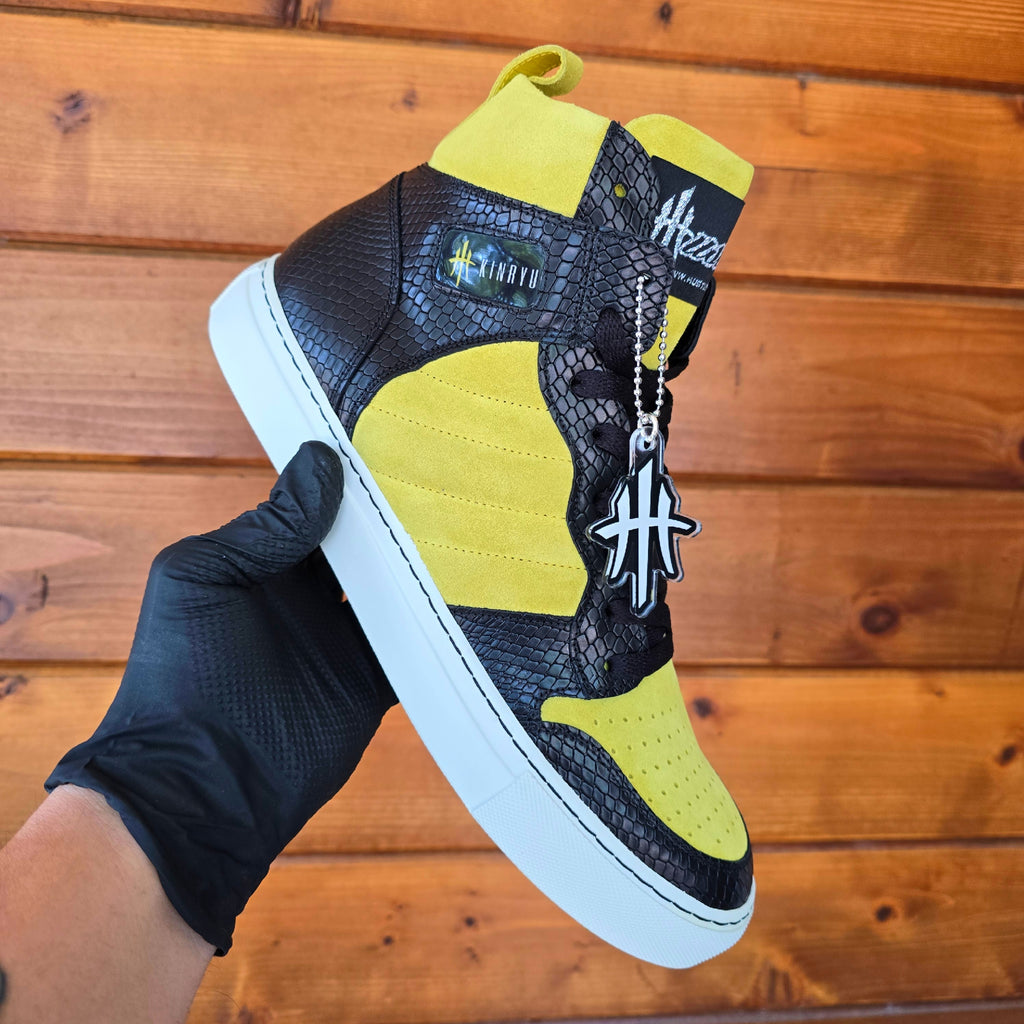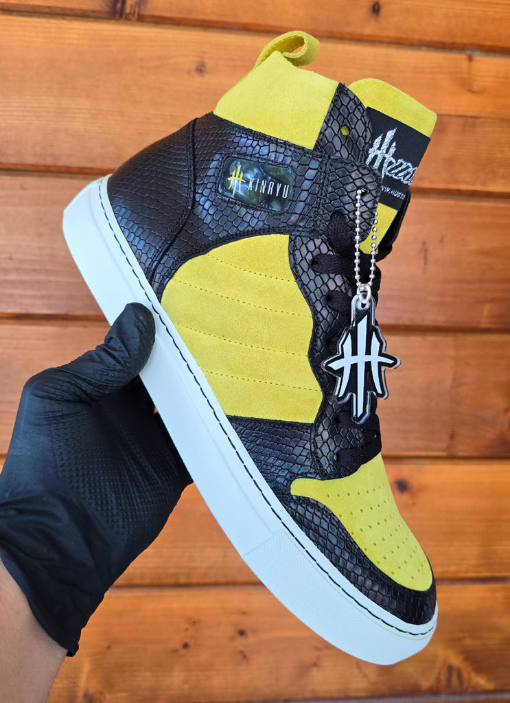 The HustleHardUSA/ KINRYU (K2) "Golden Dragon" is a Custom Sneaker constructed in ALL LEATHER: Yellow suede, Black Python Leather Print, White rubber sole, White Laces with black nylon stitching at the sole! HAND CRAFTED IN ITALY!