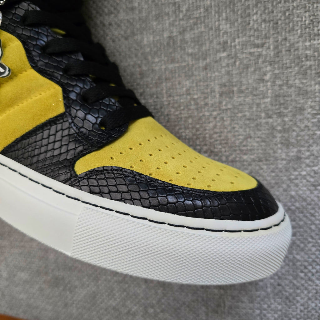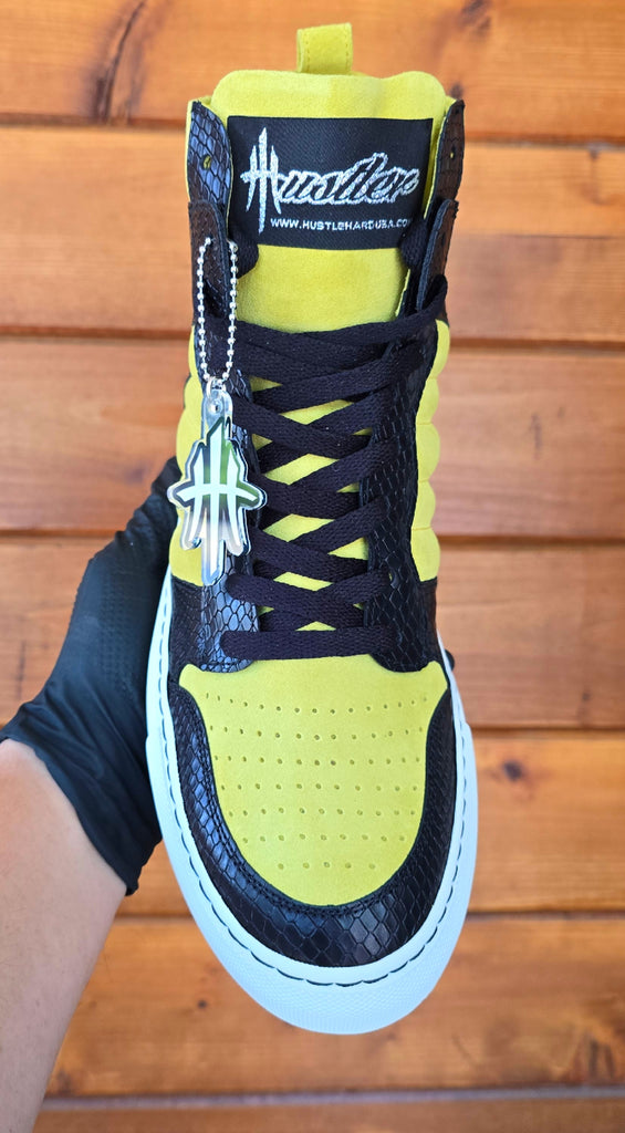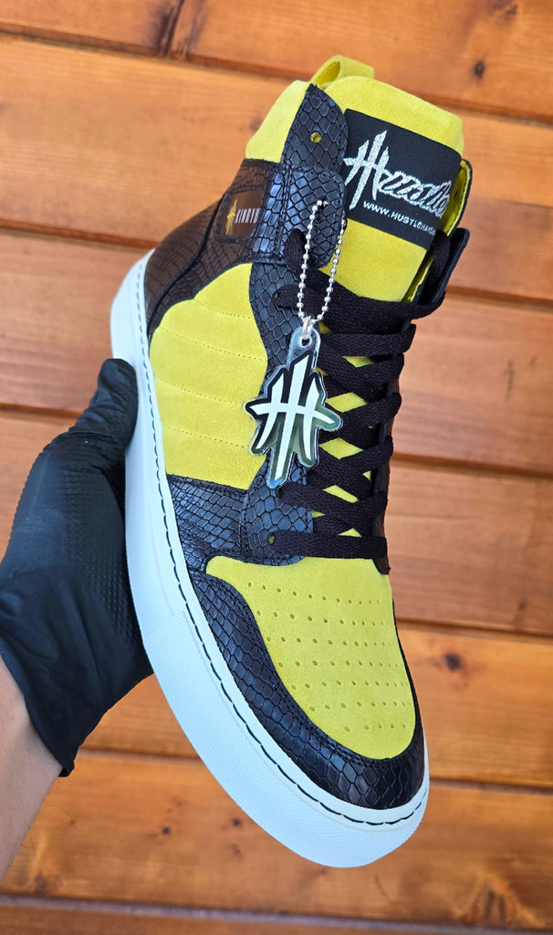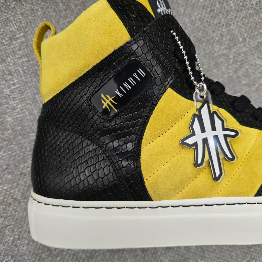 The HustleHardUSA/ KINRYU (K2) "Golden Dragon" is a Custom Sneaker constructed in ALL LEATHER: Yellow suede, Black Python Leather Print, White rubber sole, White Laces with black nylon stitching at the sole! HAND CRAFTED IN ITALY!
