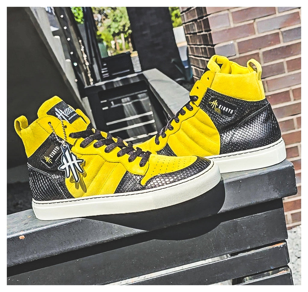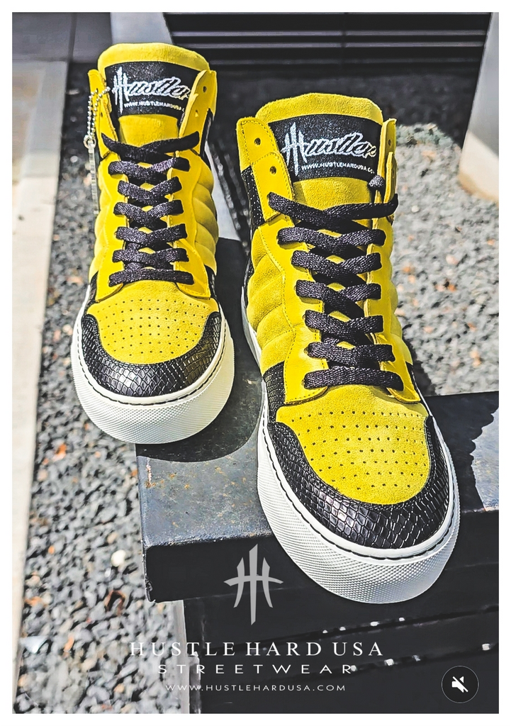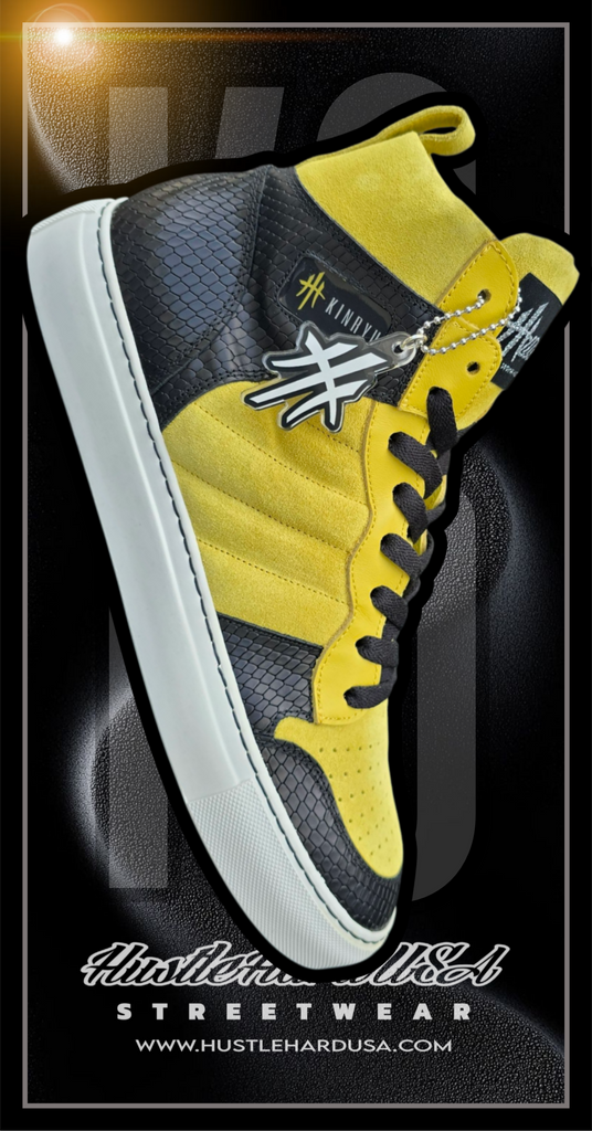 The HustleHardUSA/ KINRYU (K3) "Golden Dragon" is a Custom Sneaker constructed in ALL LEATHER: Yellow suede leather, Yellow calfskin leather, Black Python Leather Print, White rubber sole, White Laces with black nylon stitching at the sole! HAND CRAFTED IN ITALY!